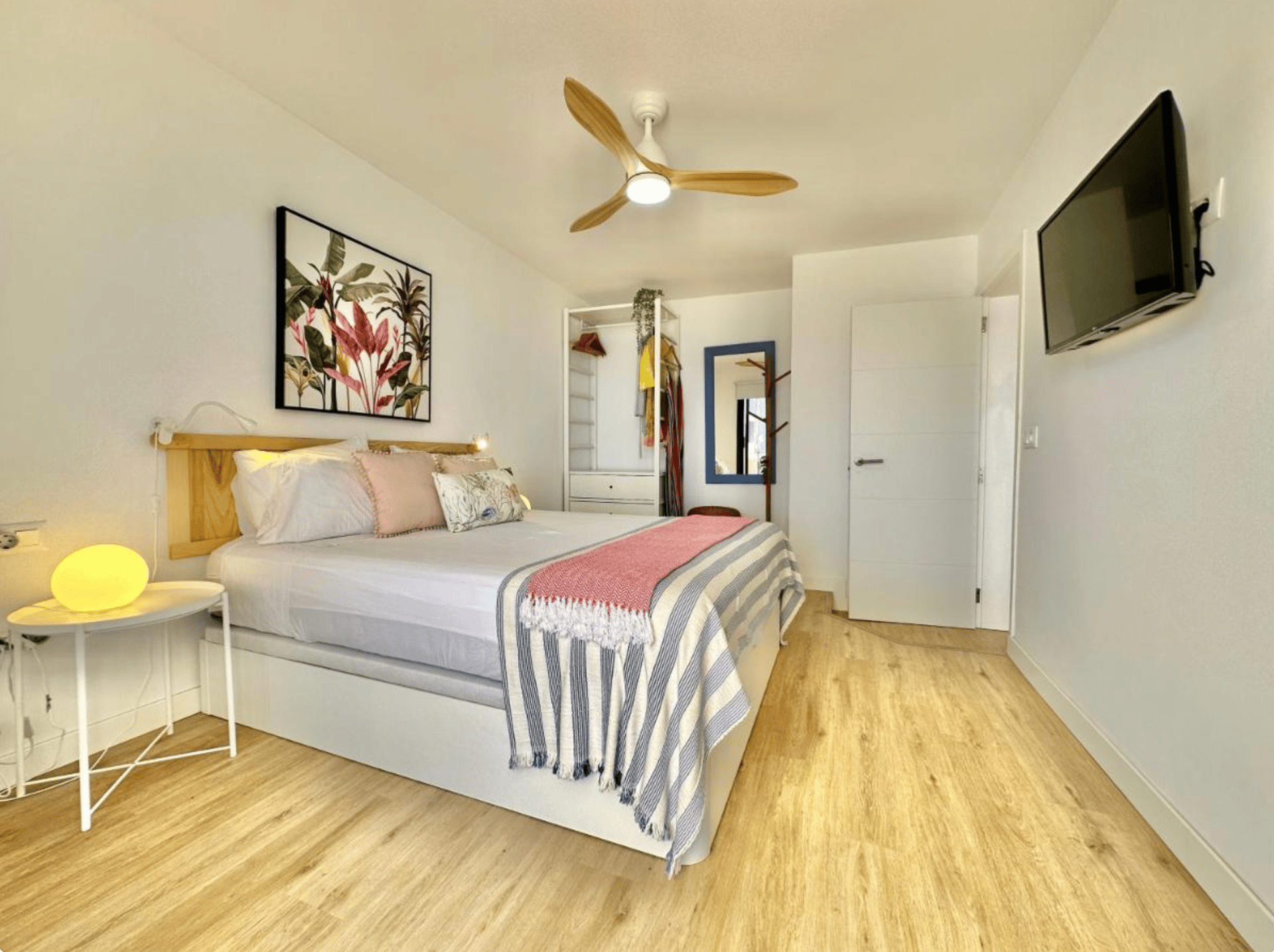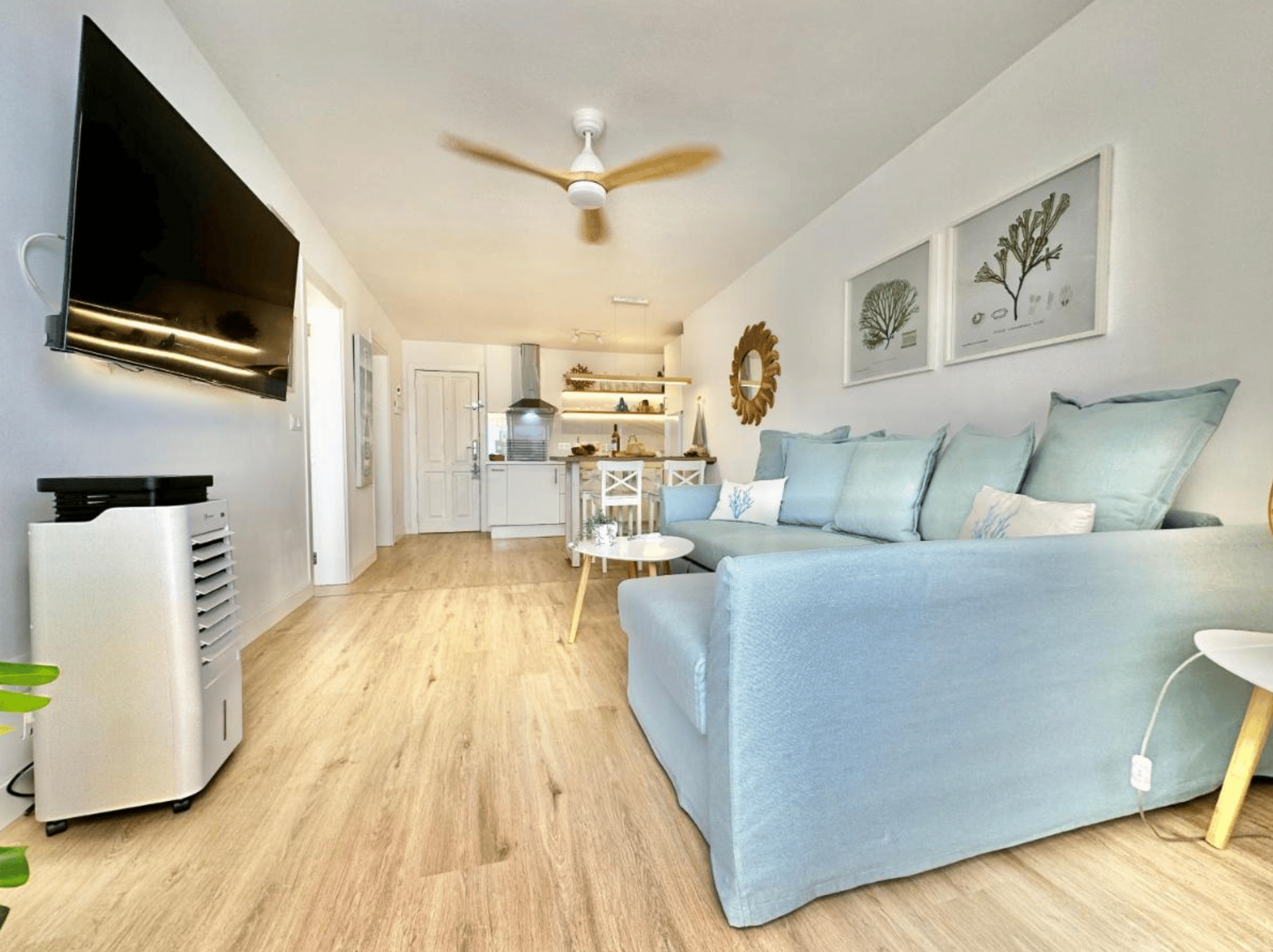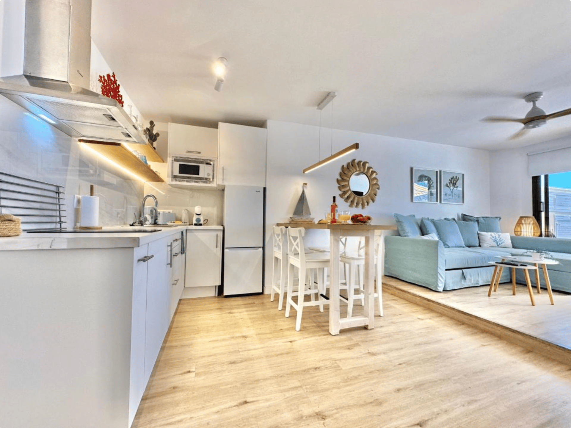 Cuenta con cocina completa, salón con Smart TV, dormitorio doble y una terraza privada donde puedes desayunar al sol o descansar después de explorar la isla.